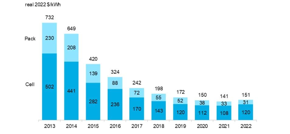 Vývoj vážené průměrné ceny bateriových jednotek (pack) s rozdělením na cenu bateriových článků (cell) a zbylých částí bateriové jednotky (v cenách roku 2022). Zdroj: BNEF