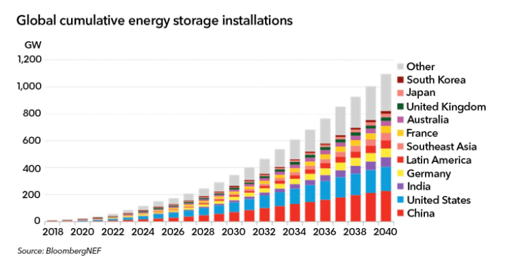 Podle aktuálních předpovědí BloombergNEF vzroste globální výkon světových bateriových úložišť energie do roku 2040 více než stonásobně. V roce 2018 byla instalována úložiště na úrovni 9 GW/17 GWh a očekávání jsou, že v roce 2040 to bude 1 095 GW/2 850 GWh. Nárůst bude způsoben poklesem nákladů li-on baterií, ale také rostoucím podílem solárních a větrných elektráren.