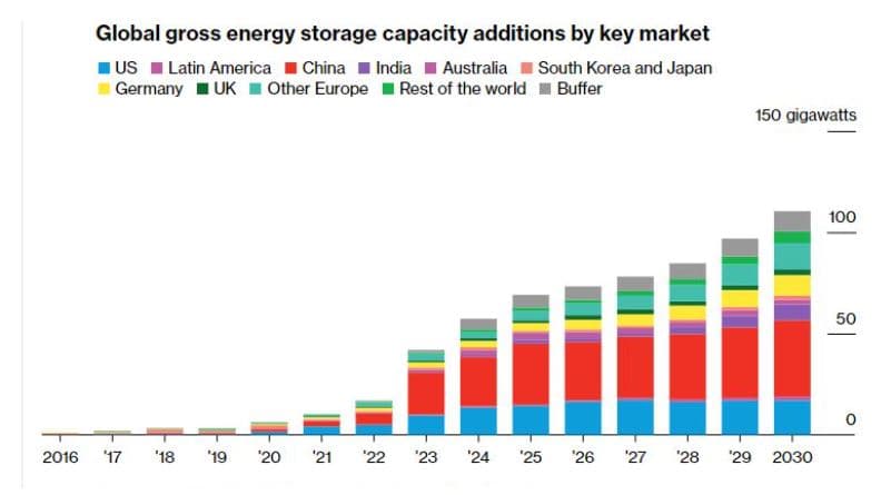 Výzkumníci z BloombergNEF (BNEF) očekávají, že v letošním roce budou uvedena do provozu úložiště elektřiny o celkovém výkonu 42 GW a kapacitě téměř 100 GWh. Do roku 2030 je očekáván průměrný meziroční růst o 27 % až na roční přírůstek 110 GW a 372 GWh. Pokud se výhled naplní, bude v roce 2030 ve světě v provozu zhruba 650 GW úložišť elektřiny.