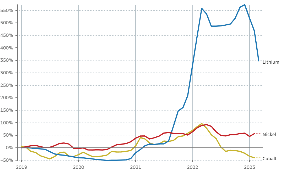 Podle společnosti Benchmark Mineral Intelligence se cena uhličitanu lithného po dvou letech prudkého růstu od ledna propadla o více než 65 %. Ceny klesají i u dalších kovů, které se používají v bateriích, jako je kobalt a nikl. Těžební společnosti tento pokles nicméně neznepokojuje, a i nadále očekávají příznivé zisky, jelikož zejména rozvoj elektromobility vytváří stabilní růst poptávky.