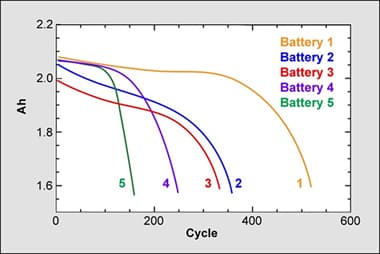 Vidíme také, že pokles kapacity záleží na kvalitě testované baterie, například baterie číslo 5 dokáže dodat prvních několik desítek cyklů stejnou kapacitu jako baterie číslo 1, ale její zbývající kapacita začne rychle klesat a dosáhne tak zlomku předpokládané životnosti. Je potřeba dávat velmi dobrý pozor na kvalitu výrobce náhradních baterií především pro spotřební elektroniku.