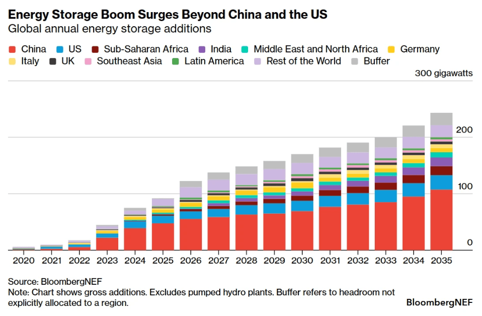 BNEF očekává, že nový instalovaný výkon bateriových úložišť ve světě bude v příštích letech stabilně růst a že celkový instalovaný výkon těchto zařízení dosáhne v roce 2035 hodnoty 2 TW. Jejich kapacita by ve stejném roce měla činit 7,3 TWh. Proti roku 2025 se jedná o nárůst na zhruba osminásobek.