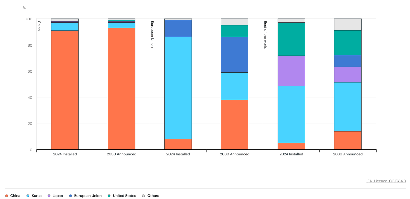 "Za poslední dva roky ztratili korejští výrobci, kteří jsou dlouhodobě největšími výrobci baterií v Evropě, téměř čtvrtinu svého tržního podílu v Evropské unii, když jim poklesl z téměř 80 % v roce 2022 na 60 % v roce 2024 mimo jiné v důsledku rostoucího úspěchu LFP baterií vyrobených v Číně," uvedla IEA a dodala, že některé korejské společnosti již začaly investovat do výroby LFP baterií v Evropě, aby lépe čelily konkurenci ze strany čínských výrobců.