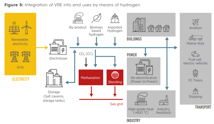Například v průmyslu by vodík vyráběný za použití elektřiny z obnovitelných zdrojů mohl nahradit vstupní suroviny založené na fosilních palivech včetně zemního plynu. Vodík může být rovněž až do určitého podílu vstřikován do existující plynové infrastruktury. Tím by se ve výsledku snížila spotřeba zemního plynu a tedy emise CO2. V neposlední řadě mohou být vodíkové články využívány v dopravě. Podle studie IRENA mohou vodíkové články přispět k překonání některých současných omezení bateriových systémů používaných pro elektromobily.