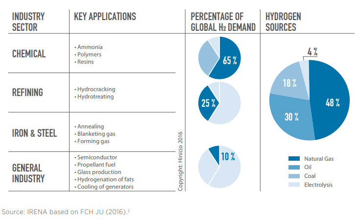 Studie IRENA v počátcích nepřímo doporučuje zaměřit se na velké projekty a na sektory, kde využití vodíku bude mít největší dopad z hlediska boje proti změně klimatu. Takto by došlo k velkým úsporám z rozsahu s minimálními infrastrukturními požadavky a zároveň by využití vodíku bylo nejefektivnější z environmentálního hlediska. Vhodnými sektory by byl petrochemický, či ocelářský průmysl, nebo nákladní doprava.
