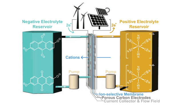 Technologie průtokových baterií je již delší dobu považována za vhodného kandidáta pro uchování elektrické energie z obnovitelných zdrojů. Až dosud byly ale druhy kapalin používané v bateriích buď toxické a drahé chemikálie, které vyžadovaly vysoké teploty pro provoz, nebo byly limitované množstvím elektrické energie, které mohly dodat. Vědci ze Stanfordovy univerzity stojí za vývojem nové průtokové baterie s kombinací materiálů, která je schopna uchovat velké množství elektrické energie. S následujícím vývojem by tato technologie mohla rychle dodávat elektřinu do elektrické sítě, být cenově dostupná a to při provozu za „pokojových“ teplot.