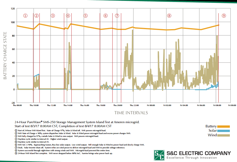 Níže je přiložen diagram průběhu nabití baterií a výroby ze zdrojů OZE. Po proběhlém testu byla oblast plynule přifázována zpět k síti bez přerušení dodávky elektřiny. Krátkodobé provozy síti pomocí zdrojů OZE nejsou dnes již nijak výjimečné, avšak většinou se jedna pouze o jednotky hodin. Zmiňovaný projekt disponuje výhodou možnosti přejít do ostrovního provozu bez přerušení dodávek elektřiny.