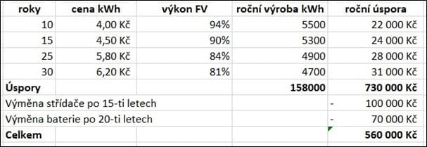 Pro tento druhý výpočet započítáme investiční výdaje a také náklady na údržbu systému, které na základě dlouhodobých zkušeností a statistik stanovíme paušálně ve výši 0,5% investice za rok (tedy cca 1600 Kč). Dále započítáme vliv stárnutí FV panelů (mínus 1 % výroby ročně) a pro jistotu pravděpodobnou výměnu mikrostřídačů a regulátoru po 10. roce provozu v ceně 50 tis. Kč. Měniče Victron se to s nejvyšší pravděpodobnost týkat nebude, protože je to nízkofrekvenční transformátorový typ, jehož životnost je mnoho desítek let a v případě závady lze levně a snadno opravit výměnou konkrétní vadné součástky. Kromě pravděpodobně rostoucí ceny elektřiny (čímž záměrně návratnost zhoršujeme) zanedbáváme i klesající hodnotu peněz (inflaci). Ve výpočtu dále také neuvažujeme žádnou investiční dotaci.