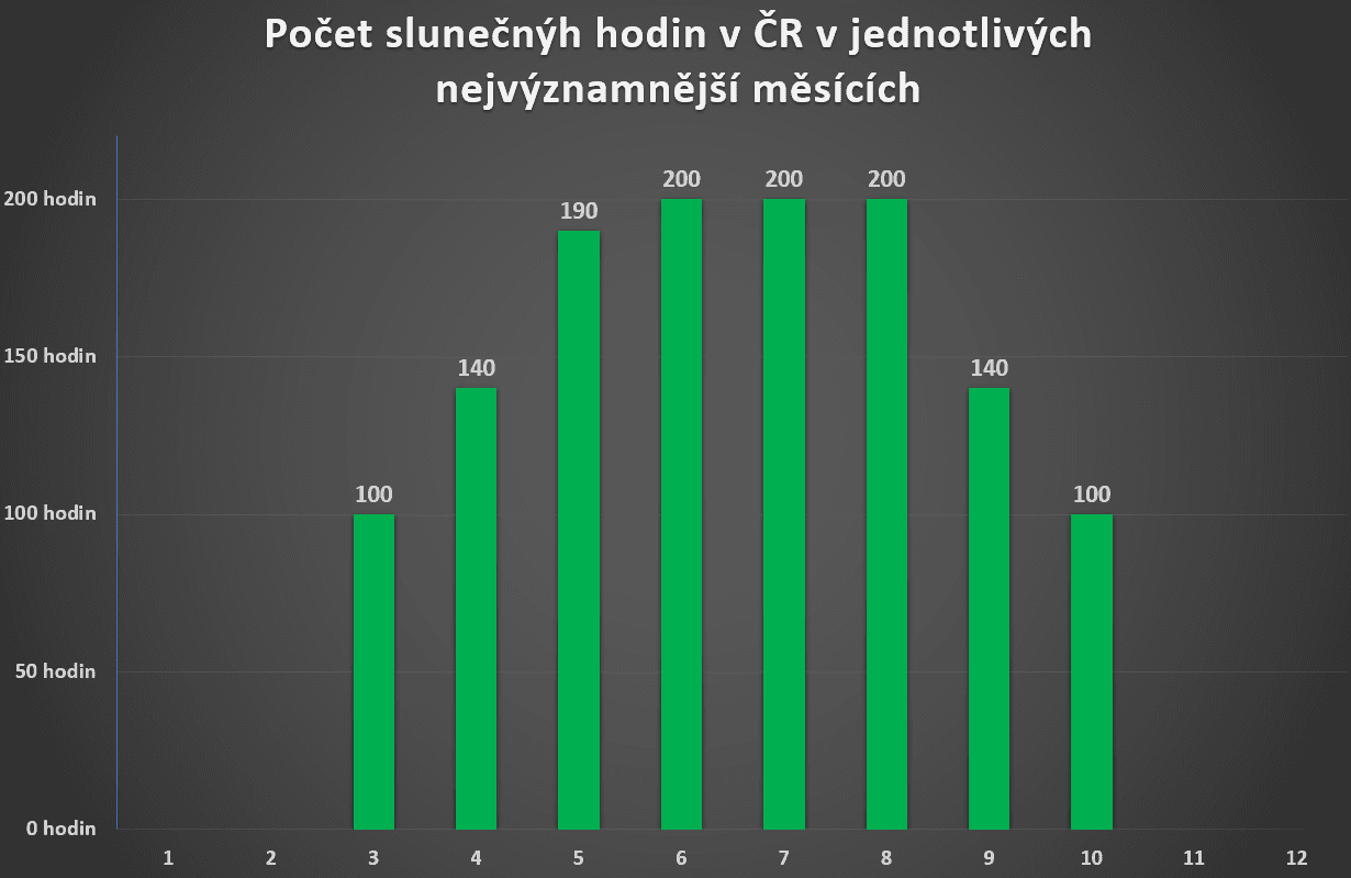 Při instalovaném výkonu 1 kWp znamená jedna hodina slunce přibližně 0,5 až 0,8 kWh vyrobené elektřiny. Velmi totiž záleží na úhlu naklonění panelů – ne vždy je možné panely instalovat v ideálním sklonu 45° a ještě ke všemu přesně na jih. Pokud vydělíme měsíční počet slunečných hodin průměrným počtem dnů v měsíci (30) a vynásobíme koeficientem 0,5 až 0,8, získáme průměrnou denní výrobu. Na jaře a podzim tedy asi 4 – 5 kWh denně, v létě pak spíše 6 – 7 kWh.