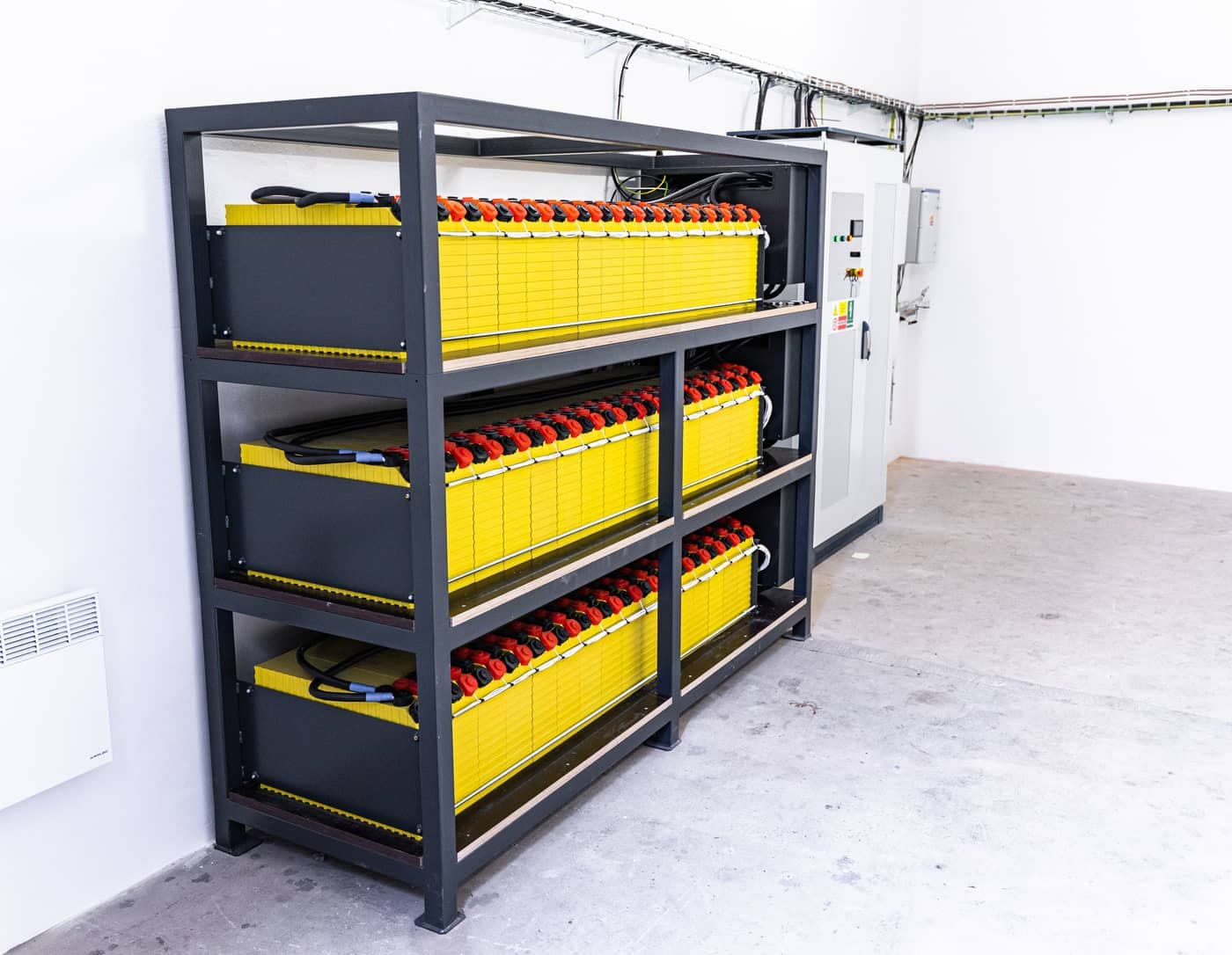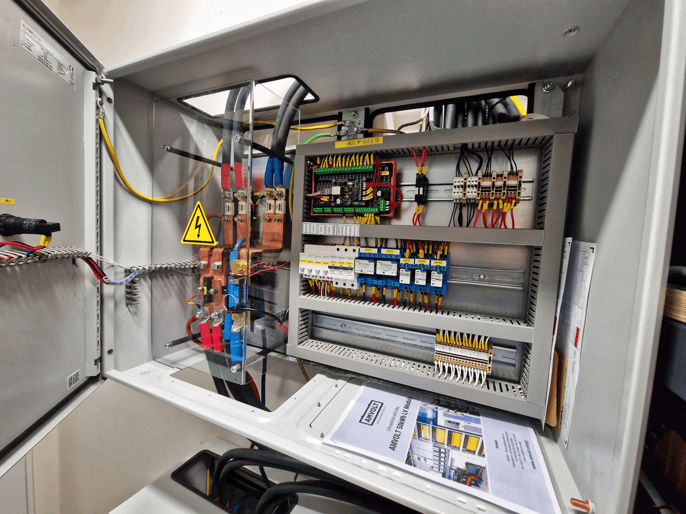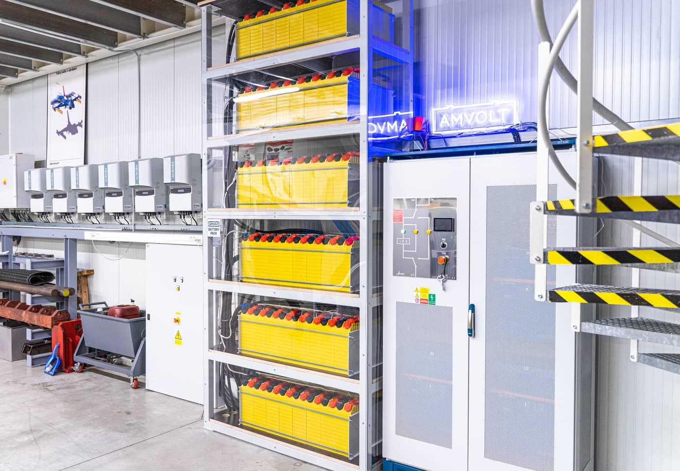 Vcházíme do plného provozu menší výrobní haly na ohýbání plechu v Uhříněvsi u Prahy. Všude jedou stroje, zaměstnanci v plném vytížení. Nacházíme velkorysou technickou místnost, kde se až ke stropu ve výšce 3,5m doslova tyčí vizuálně a objemově nepřehlédnutelná žlutá věž. Jedná se o české bateriové úložiště AMVOLT, konkrétně o 3 kusy AMVOLT 50 kWh LV Modulů s celkovou kapacitou 150 kWh. Úložiště v této realizaci akumuluje přebytečnou energii z FV, funguje jako záloha firemního provozu a optimalizuje náklady za elektrickou energii. V tomto článku se podíváme blíže právě na AMVOLT 35 a 50 kWh LV Moduly.