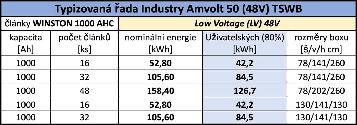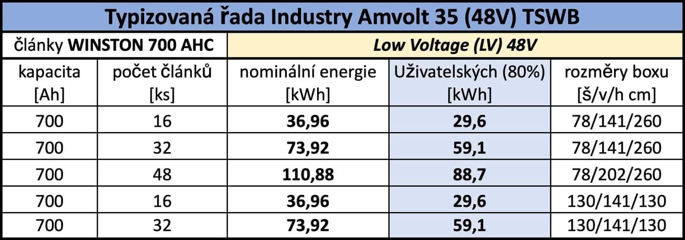 Každý AMVOLT LV Modul je navržen pro 16 kusů LiFePO₄ článků Winston WB-LYP700AHA 3.3 V, 700 Ah s nominálním napětím 48 V nebo 16 kusů LiFePO₄ článků Winston WB-LYP1000AHC 3.3 V, 1000 Ah s nominálním napětím 48 V a certifikací ČSN EN 62619. AMVOLT LV Modulů může být v technické místnosti (nebo v kontejneru) libovolný počet – na sobě i vedle sebe podle možností prostoru a požadavků zákazníka. Moduly je možné rozměrově koncipovat i na míru zákazníka dle specifických prostorových potřeb mimo standardizované rozměry, což je právě příklad instalace, na které jsme se byli podívat v Uhříněvsi (viz níže).