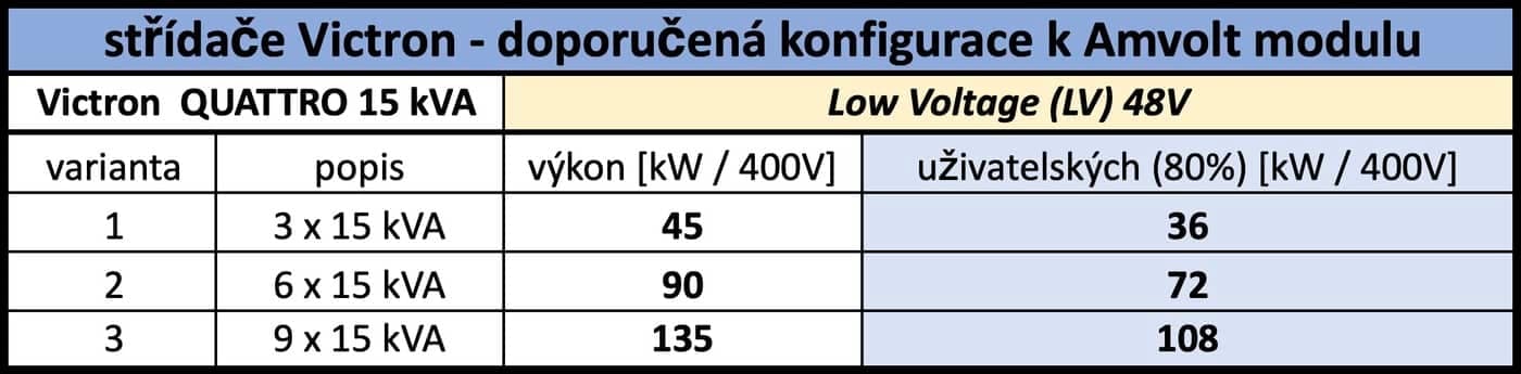 S bateriovými úložišti AMVOLT výrobce standardně dodává a doporučuje měniče Multiplus I., Multiplus II. nebo Quattro od společnosti Victron Energy, které jsou v tuto chvíli 100 % kompatibilní a ověřené. AMVOLT LV Moduly se mohou vybíjet i nabíjet maximálním výkonem 108 kW téměř v celém rozsahu kapacity (tedy až 3 C). Pro maximální životnost však doporučujeme využívat proud max 1 C. Dle Petra Hrubého je AMVOLT na žádost zákazníka schopen dodat pouze bateriové úložiště samotné, avšak měniče Victron Quattro přesto doporučuje jako nejvhodnější.