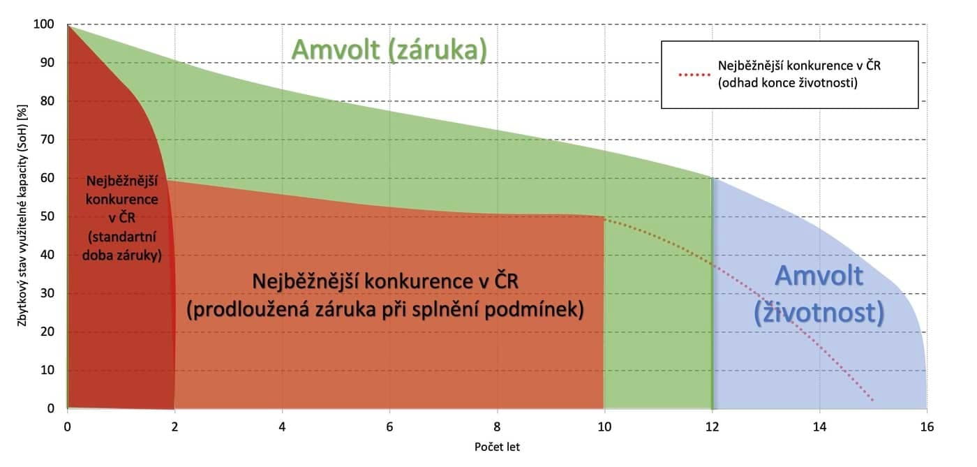AMVOLT nabízí v ČR ke svým LV Modulům záruku 12 let na mechanickou konstrukci a výrobní vady článků, 5 let na BMS + střídače, 2 roky na ostatní komponenty (EZS, EPS). Provozní životnost baterie výrobce uvádí 60% SOH ≥ 8 000 cyklů, při pravidelných servisních kontrolách a používání 0,5C; 70% DOD; 25°C.Investiční náklady podobné baterie jsou sice mírně vyšší (cca 10 %), než při koupi hotového krabicového řešení z Asie, nicméně při započtení předpokládané životnosti a možnosti celé úložiště libovolně servisovat, rozšiřovat či jinak modifikovat vychází cena za jednu uloženou a odebranou kWh lépe, než u běžně dostupných masových produktů.