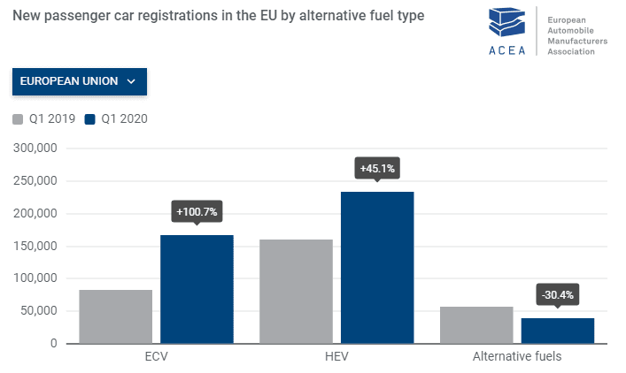 Podle Evropské asociace výrobců automobilů elektromobily v prvním kvartálu roku 2020 významně zvýšily svůj podíl na trhu. Nyní mezi novými automobily tvoří 6,8 % trhu, přičemž v prvním kvartálu roku 2019 to bylo pouze 2,5 %. Důvodem je zejména obecný pokles nových nákupů a registrací osobních vozidel v důsledku pandemie koronaviru. Informoval o tom portál Euractiv.