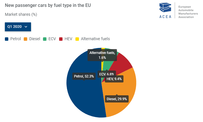 Podle dat Evropské asociace výrobců automobilů (European Automobile Manufacturers Association) celkové prodeje osobních automobilů v Evropské unii, Spojeném království a zemích EFTA během prvních tří měsíců tohoto roku poklesly o 16,5 %. Celkem bylo v prvním kvartálu roku 2020 registrováno v EU o něco málo více než 3 miliony vozidel, z toho 52,3 % benzínových a 29,9 % dieselových. Důvodem nižších prodejů byly i uzavřené prodejny, ale také celkově nižší poptávka v důsledku pandemie koronaviru.