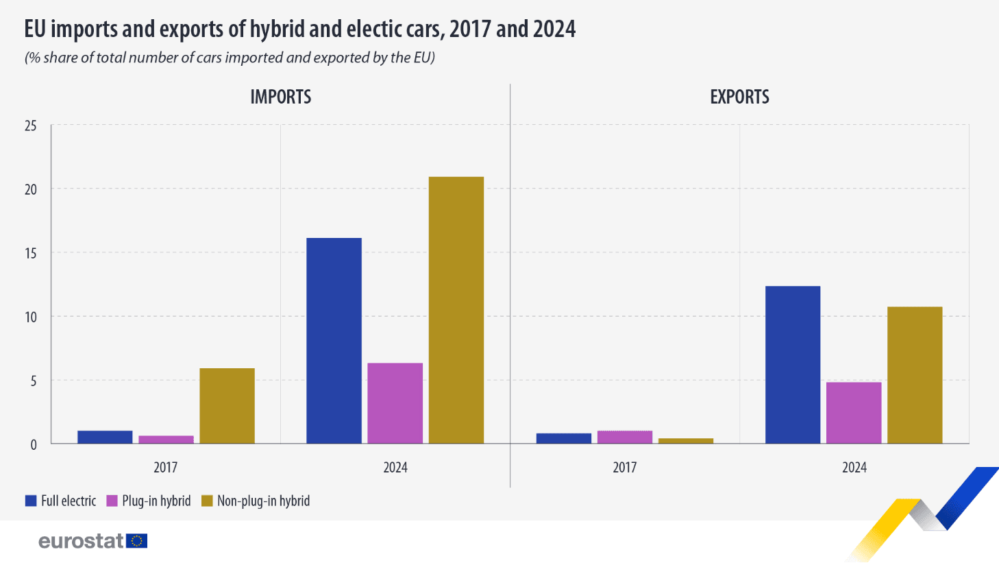 Necelou třetinu loni vyvezených aut ze zemí Evropské unie tvořily elektromobily (12 %) a hybridy (16 %). Podíl těchto typů vozů na celkovém importu automobilů do EU klesl loni meziročně o 1 procentní bod na 43 % (16 % elektromobily a 27 % hybridy). Pro srovnání, v roce 2017 činil podíl elektromobilů a hybridů na dovozu automobilů do EU 8 % a podíl na exportu byl pouhá 2 %.