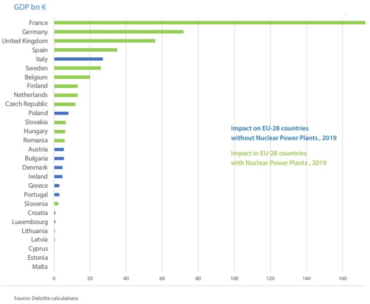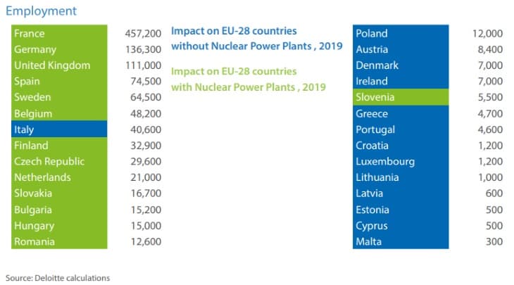 Podle nové studie od společnosti Deloitte každý instalovaný gigawatt v jaderné energetice v EU vyvolává roční investice ve výši 9,3 miliard eur (239 miliard korun) v jaderných a subdodavatelských odvětvích. Poskytuje stálou a lokální zaměstnanost pro téměř 10 000 osob.