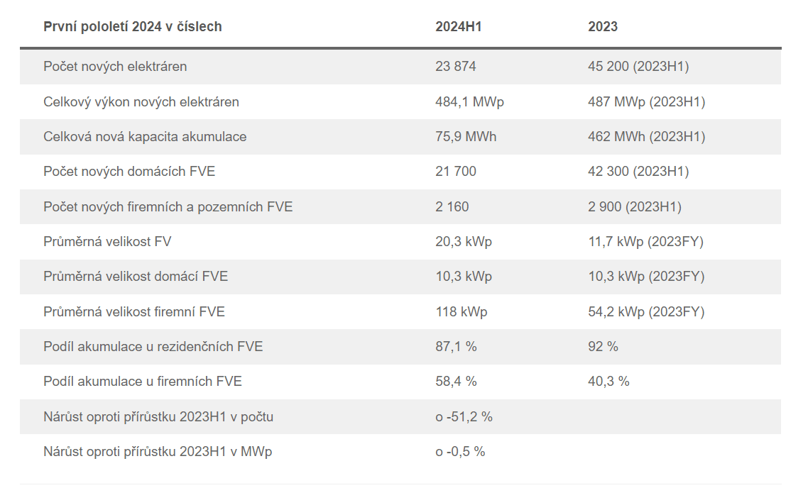 Nejdůležitější ukazatel, celkový výkon nově připojených solárních elektráren, v prvním pololetí 2024 dosáhl 484 MWp, což je téměř stejná hodnota jako ve srovnatelném období roku 2023 (487 MWp). Rezidenční trh totiž vyrovnaly instalace firemních FVE.