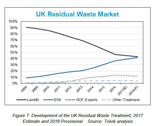 Analytická společnost Tolvik, která se zaměřuje na odpadový a bioenergetický sektor, v červnu 2018 vydala pravidelnou roční zprávu o výrobě energie z odpadu ve Velké Británii. Podle této zprávy bylo v prosinci 2017 ve Velké Británii 40 zařízení vyrábějících energii z odpadu. Podle odhadů bylo v zemi na energii přeměněno 39,1 % reziduálního odpadu.