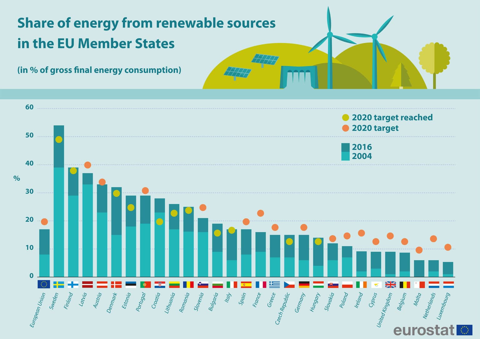 Nizozemsko má pro rok 2020 cíl v podílu výroby OZE na konečné spotřebě stanoven na 14 %, což je jen o procento více, než má ČR. Ovšem podle posledních oficiálních statistik z Eurostatu za rok 2016 měla ČR již téměř 15 % a Nizozemsko pouze 6 %.