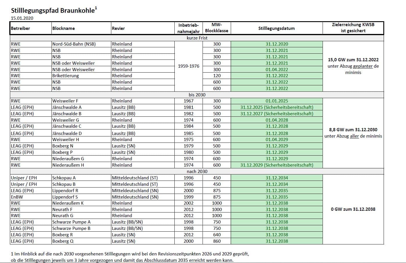 Téměř rok poté, co německá uhelná komise předložila svou závěrečnou zprávu, v níž rozhodla o harmonogramu postupného odklonu výroby elektřiny z uhlí s konečným datem v roce 2038, se německá vláda, zasažené spolkové země a provozovatelé hnědouhelných elektráren dohodli na detailním harmonogramu odstavování hnědouhelných elektráren.