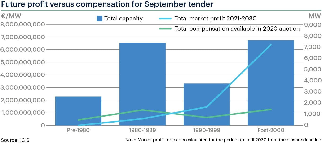 Analytici ICIS vypočítali očekávaný tržní zisk německých černouhelných elektráren v příštím desetiletí s přihlédnutím k předpokladům vývoje ceny elektřiny, paliva a emisních povolenek. Zisk byl poté porovnán s možnou maximální kompenzací dostupnou v jednotlivých aukcích.