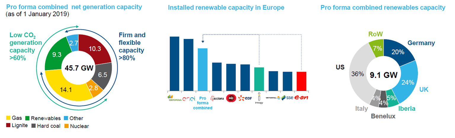 Obnovitelné zdroje energie RWE dokonce i po loňské dohodě s konkurenčním koncernem E.ON, v rámci které převezme OZE dosud provozované společností innogy a E.ONem, dosáhnou pouhé pětiny celkového instalovaného výkonu společnosti. V celkovém instalovaném výkonu OZE v Evropě se v porovnaní s ostatními evropskými hráči RWE s 5,2 GW vyhoupne na třetí pozici.