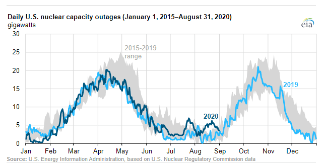 Odstávky amerických jaderných elektráren během června až srpna 2020 dosáhly průměru 4,2 GW. To je o více než polovinu více než v loňském roce, kdy byl letní průměr 2,7 GW. Nejnižší byly odstávky od konce června do poloviny července, kdy dosahovaly průměru 2,3 GW. Naopak nejvyšší byly odstávky v druhé polovině července. Nejvíce bylo odstaveno 6,5 GW výkonu jaderných elektráren právě na konci července a 6,2 GW v srpnu.