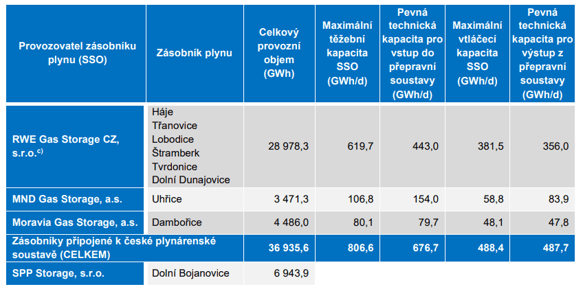 Kapacita PZP připojených do plynárenské sítě ČR činí 36,9 TWh, což například pro rok 2020 představovalo zhruba 40 % roční spotřeby zemního plynu v celé ČR. V posledních letech se spotřeba plynu v ČR pohybuje okolo 8,5 miliard metrů krychlových za rok (přibližně 90 TWh). Technické parametry zásobníků plynu v ČR shrnuje následující tabulka.
