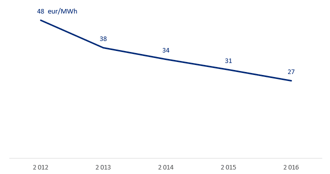 Cena elektřiny base load na následující kalendářní rok od roku 2012 pravidelně každý rok klesala. Roční průměr denních hodnot v roce 2012 na kalendářní rok 2013 dosáhl 48 EUR/MWh, v loňském roce cena pro kalendářní rok 2017 byla o téměř 20 EUR/MWh nižší, když roční průměr denních hodnot dosáhl 27 EUR/MWh. Až letošní rok s největší pravděpodobností klesající trend změní. Do konce července 2017 byl průměr denních hodnot elektřiny base load pro kalendářní rok 2018 30,4 EUR/MWh a od té doby cena futures nadále roste.