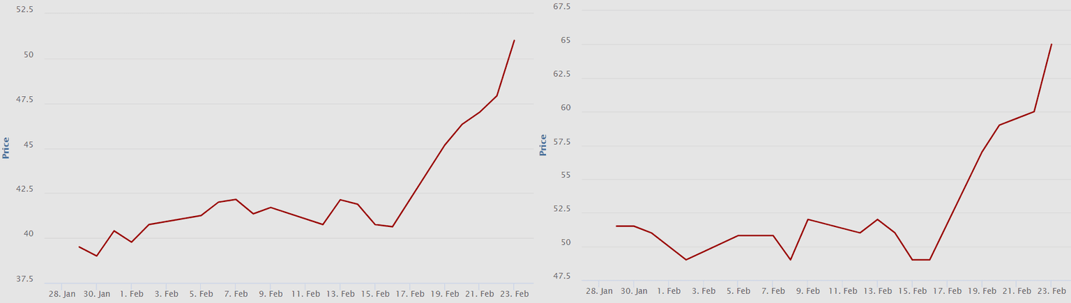 Ceny elektřiny baseload (vlevo) a peakload s dodávkou v 9. týdnu v ČR. Zdroj: EEX