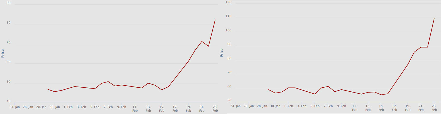 Ceny elektřiny ve Francii s dodávkou v tomto týdnu minulý pátek vzrostly nad hranici 80 Eur/MWh v případě kontraktu baseload a na 110 Eur/MWh v případě peakload kontraktu. Od 15. února tak vzrostly o zhruba 60 % (baseload), respektive 100 % (peakload). Důvodem je vysoký podíl elektrického vytápění ve Francii. Dle dat Evropské sítě provozovatelů přenosových soustav elektřiny (ENTSO-E) při poklesu teploty o jeden stupeň Celsia (mezi hodnotami 18 až -11 °C) vzroste zatížení ve francouzské elektrizační soustavě o 2,3 GW.