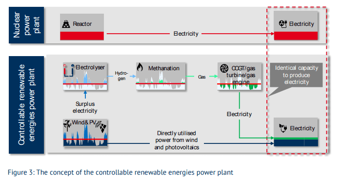 Takové elektrárny by se skládaly z fotovoltaických panelů, větrné elektrárny, elektrolyzérů a plynové elektrárny, která zaručí kontrolu nad výkonem zdrojem. Studie zkoumá, jak vysoké jsou náklady takové elektrárny ve srovnání s plánovanými, či budovanými jadernými elektrárnami v zemích Visegrádu.