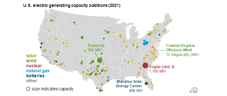 Americká vládní agentura U.S. Energy Information Administration (EIA) v letošním roce očekává růst instalovaného výkonu ve velkých, takzvaných utility-scale elektrárnách (o výkonu vyšším než 1 MW) o bezmála 40 GW. Většinu nového výkonu mají tvořit solární a větrné elektrárny, a to celkem 70 %. Ke slovu se v poslední době začínají dostávat i velké bateriové systémy, které by letos měly tvořit více než desetinu nového výkonu. Posledních 20 % připadá především na plynové zdroje a jeden nový jaderný blok, Vogtle 3.