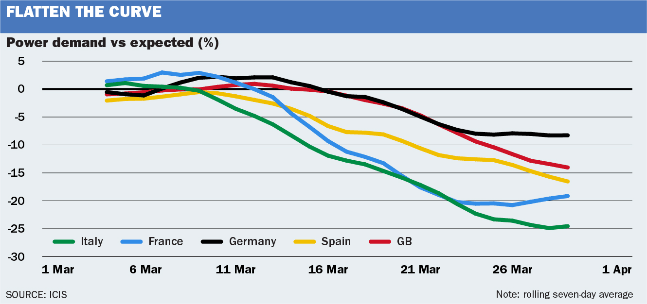 Není překvapením, že z hlediska spotřeby elektřiny je nejvíce ovlivněnou zemí Itálie, epicentrum nákazy v Evropě a země s nejpřísnějšími omezeními. Poptávka po elektřině v Itálii podle modelu ICIS klesla od vypuknutí pandemie o jednu čtvrtinu, nebo 9 GW.
