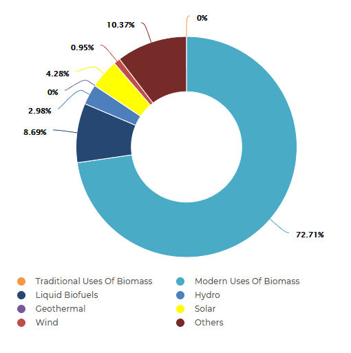 Podíl obnovitelných zdrojů energie na energetickém mixu byl v roce 2016 14,7 %. Největší podíl mají OZE v oblasti vytápění, konkrétně 21,2 %, na výrobě elektřiny se podílí z 11,4 %. Moderní využití biomasy má pak na využívání obnovitelných zdrojů největší podíl (72,7 %).