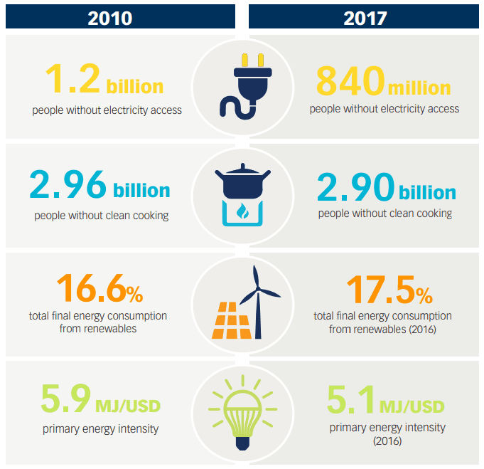 V roce 2010 bylo bez přístupu k elektřině 1,2 miliardy lidí a v roce 2017 840 milionů lidí. Globální hodnota elektrifikace tedy dosáhla 89 %. Pokud se vezme v potaz dosavadní vývoj, tak podle predikcí obsažených ve zprávě bude v roce 2030 stále 650 milionů lidí bez elektřiny a cíle tak nebude dosaženo. Zároveň je důležité zmínit, že 78 % lidí bez přístupu k elektřině žilo ve 20 zemích, mezi které patří kupříkladu Indie, Pákistán, Angola, Bangladéš a Malawi.