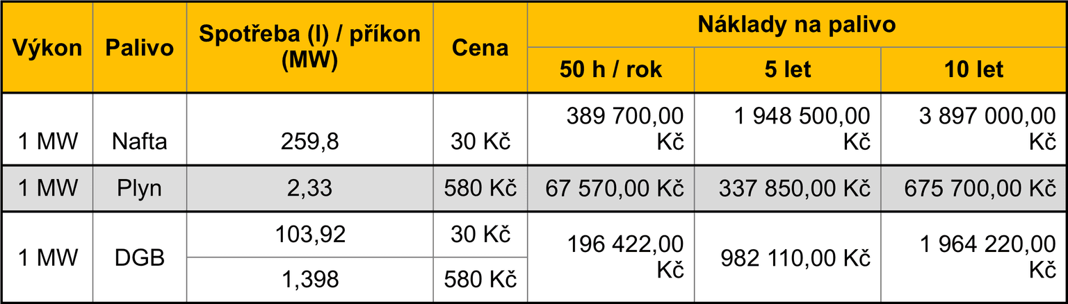 Pokud se nacházíme v ranější fázi projektu, určitě bychom se měli zamyslet, jaký záložní zdroj použít, resp. jaké palivo zvolit s ohledem na zamýšlený provoz. Provozní náklady záložních zdrojů na zemní plyn jsou dramaticky nižší než u dieselových agregátů, a to i v případech, kdy je záložní zdroj provozován v časově omezeném režimu. Obvyklá provozní doba se pohybuje mezi 50 a 100 hodin za rok. Při dnešních cenách paliv může záložní systém na zemní plyn využívaný pouze po dobu 50 hodin ušetřit ročně až 300 tis. Kč v nákladech na palivo (porovnání záložních zdrojů plyn/nafta o výkonu 1 MW, provoz 50 h/rok). V případě využívání zdroje jako nástroje pro špičkování se pak budeme pohybovat v nižších stovkách hodin, a to už by se v nákladech projevilo více a mohlo by to být i příčinnou nevýhodnosti takového řešení. Dalším přínosem používání zemního plynu jsou nižší emise výfukových plynů. Agregáty na zemní plyn s úsporným spalováním chudé směsi uvolňují až pětkrát méně NOx a v podstatě nulové množství pevných částic ve srovnání s tradičními zdroji s dieselovými motory.