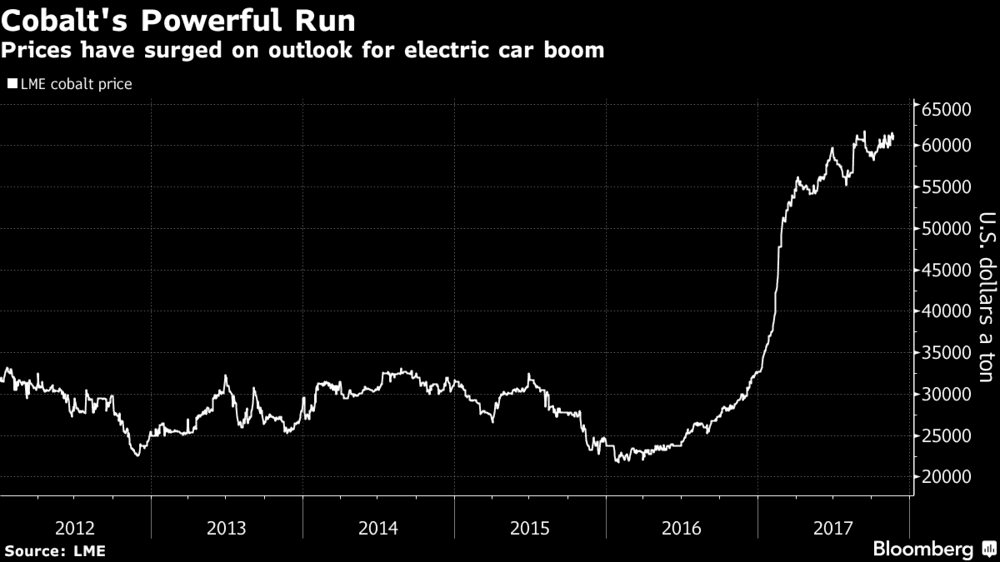 Ceny kobaltu vzrostly na dvojnásobek lednových hodnot. Zdroj: Bloomberg