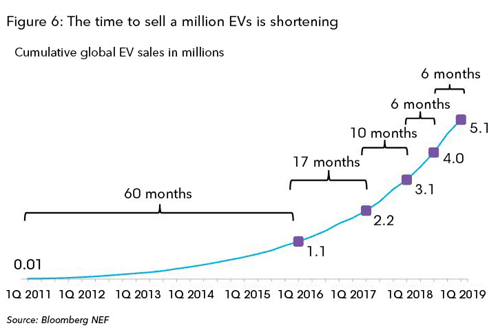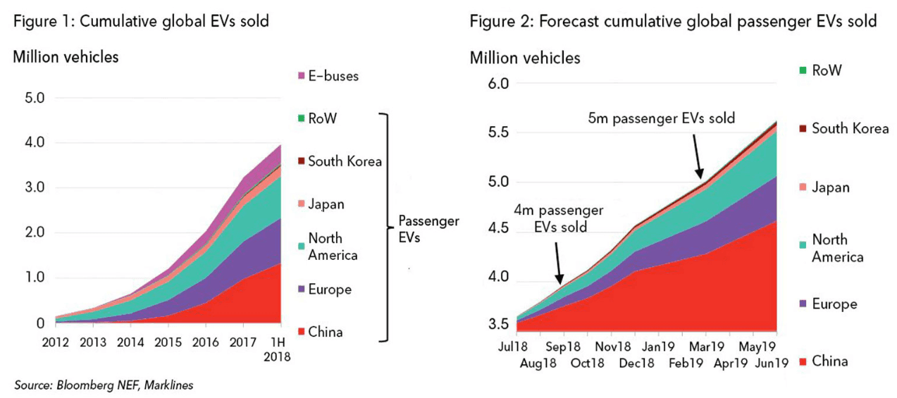 Bloomberg NEF odhaduje, že pátý milion elektromobilů bude prodán přibližně za 6 měsíců. Hranice tedy bude překročena asi v březnu 2019. Asi 42 % elektromobilů se prodá v Číně, 26 % v Evropě a 25 % v severní Americe.