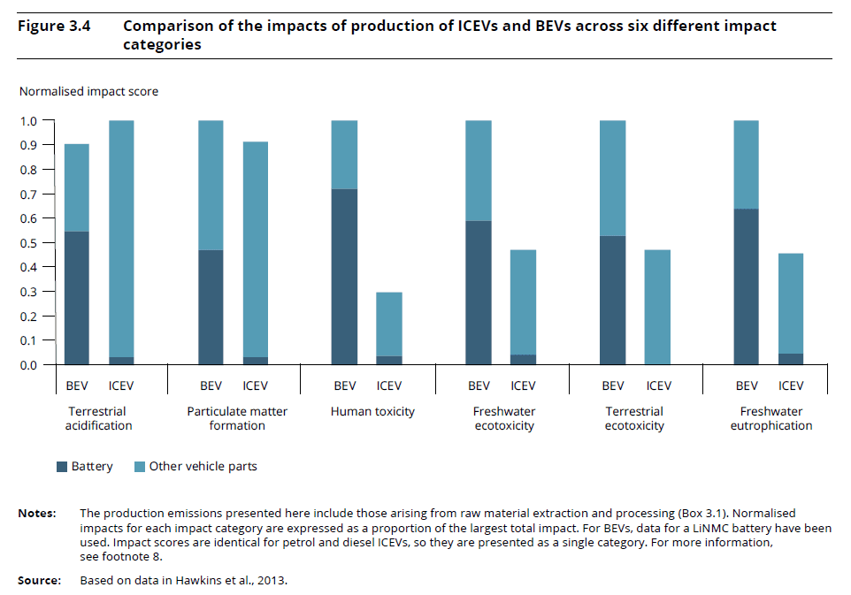 Velkým problémem je ovšem výroba elektromobilů. Elektromobily mají závažnější dopady na ekosystémy než konvenční automobily. Důvodem je zejména těžba a zpracování kovů a těžba a spalování uhlí potřebného k vyrobení elektřiny využívané ve výrobním procesu. Očekává se ovšem, že nízkouhlíková výroba elektřiny bude v Evropě a klíčových produkčních oblastech baterií (Čína, Jižní Korea, Japonsko) růst a tyto dopady budou zmírněny.
