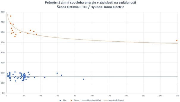 Průměrné hodnoty spotřeby za celé období dosáhly 17kWh/100km u elektrického vozu a 57kWh/100km u vozu dieselového. Při čistě mínusových teplotách činila průměrná spotřeba 18,7kWh/100km. Oproti dlouhodobému průměru se u elektrického vozidla jedná o 8% nárůst. V případě čistě mínusových teplot činí nárůst asi 18% oproti dlouhodobému průměru. U vozidla dieselového spotřeba v tomto období vzrostla o zhruba 6%. Nárůst spotřeby je tak u elektrického vozidla vyšší, ale i tak je spotřeba energie u dieselového vozidla v tomto režimu více než 3x vyšší oproti vozidlu elektrickému. Zajímavý je i tvar spojnice trendu u obou pohonů. Obě vozidla se musí po startu zahřát, což spotřebuje jednorázově určité množství energie a po zahřátí už průměrná spotřeba klesá. U elektromobilu je nicméně patrné, že samotná délka trasy nemá na výslednou spotřebu příliš významný vliv. Je to zřejmě dáno charakterem kratších cest, kdy pomalá úsporná jízda vykompenzuje energii na zahřátí. U dieselového vozidla je vidět pravý opak. Spotřebu na krátkých trasách evidentně daleko více ovlivňuje nízká účinnost studeného motoru. Spotřeba pak výrazně klesá až po desítkách ujetých km, kdy se motor zahřeje na provozní teplotu a začne pracovat s přijatelnou účinností.