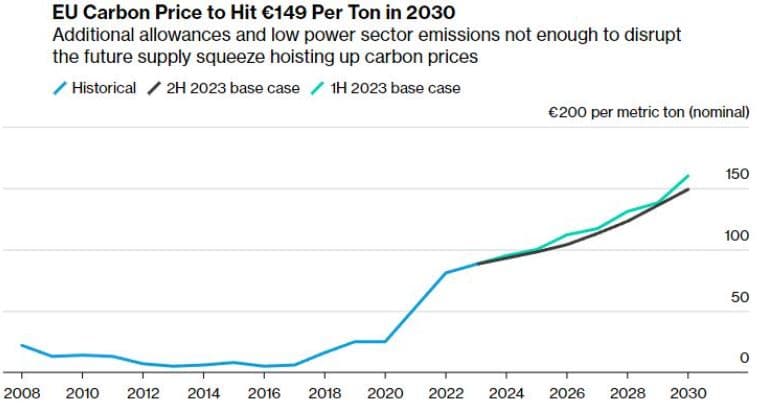 I přes popsaný trend výzkumníci z BNEF očekávají, že cena emisních povolenek v příštích letech stabilně poroste. V roce 2025 by se podle nich měla dostat na hodnotu 98 EUR/t a v roce 2030 následně až na 149 EUR/t.