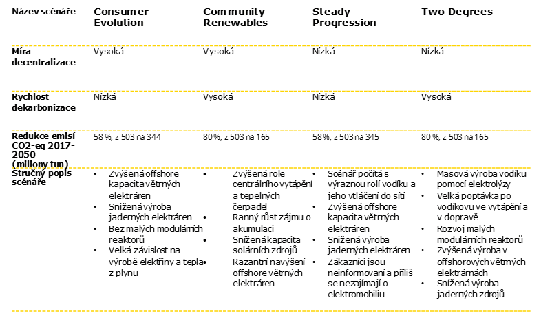 Britský operátor generuje 4 scénáře, které se vzájemně odlišují očekávanou mírou decentralizace energetiky a rychlostí dekarbonizace. Mezi druhotné indikátory, na jejichž rozdílných hodnotách a mírách naplnění jsou scénáře vystavěny, patří právní podpora, ekonomický růst, zapojenost zákazníků, technologický pokrok a energetická účinnost. Strategické scénáře vznikaly na základě vstupů a konzultací s více než 600 odborníky z průmyslu a energetiky.