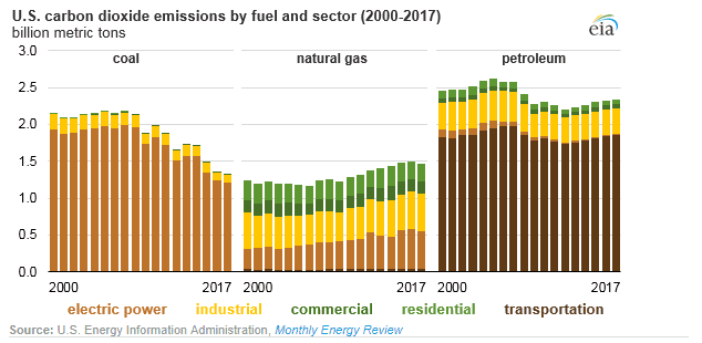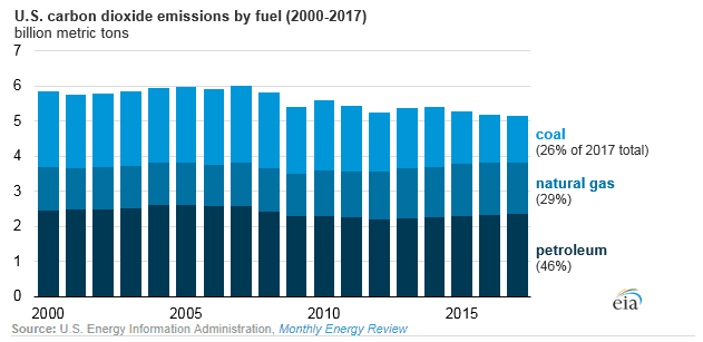 Dle dat americké vládní agentury U.S. Energy Information Administration (EIA) emise CO2 energetického sektoru v USA v roce 2017 oproti roku 2016 poklesly o 0,9 % na 5,14 miliard tun. Spotřeba ropy v roce 2017 v USA vzrostla a přispěla tak ke zvýšení emisí CO2. Naopak emise z uhlí a zemního plynu poklesly.
