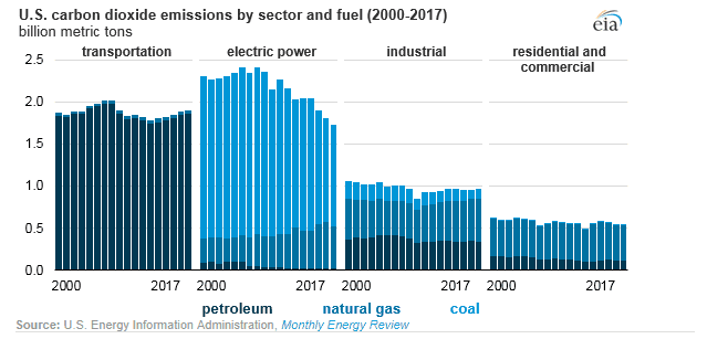 Emise CO2 energetického sektoru v USA v roce 2017 oproti roku 2016 mírně poklesly na 5,14 miliard tun. Emise byly sníženy například díky vyšší výrobě elektřiny ze zemního plynu a obnovitelných zdrojů.