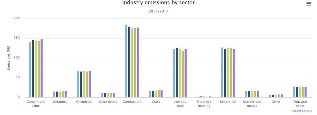Největší nárůst zaznamenal cementářský průmysl. Graf zobrazuje emise z jednotlivých průmyslů za letošní (fialová) a předchozí roky. Zdroj: Sandbag