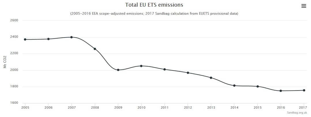 Emise pokryté evropským systémem obchodování s povolenkami loni vzrostly o 0,8 %, jak ukazují předběžné údaje publikované v úterý Evropskou komisí. To představuje první zvýšení celkových ročních emisí v EU od roku 2010. Data zahrnují emise z 10 500 zařízení a letecké dopravy, předběžné číslo se vyšplhalo na přibližně 1,72 miliard tun ekvivalentu CO2. V roce 2016 přitom zařízení vyprodukovala kolem 1,706 miliard tun sledovaných skleníkových plynů.