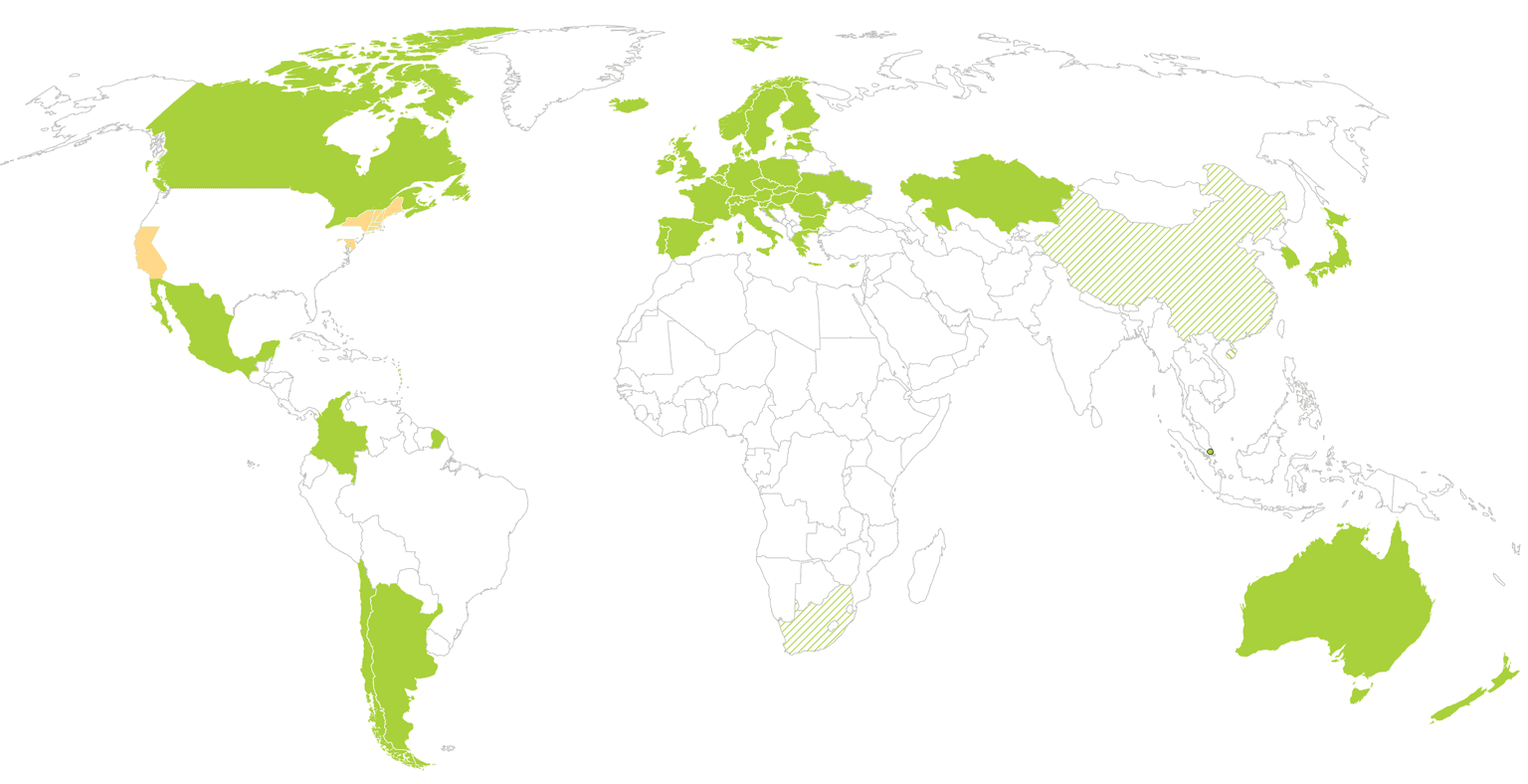 Mapa zdanění uhlíku v různých částech světa. Oranžově jsou znázorněny státy, které se uhlíkového zdaněné účastní pouze na regionální, tedy nikoli celostátní úrovni (jde o dobrovolné nástroje). Určitý způsob zdanění je nyní naplánován i v Číně a Jihoafrické republice. Zdroj: World Bank