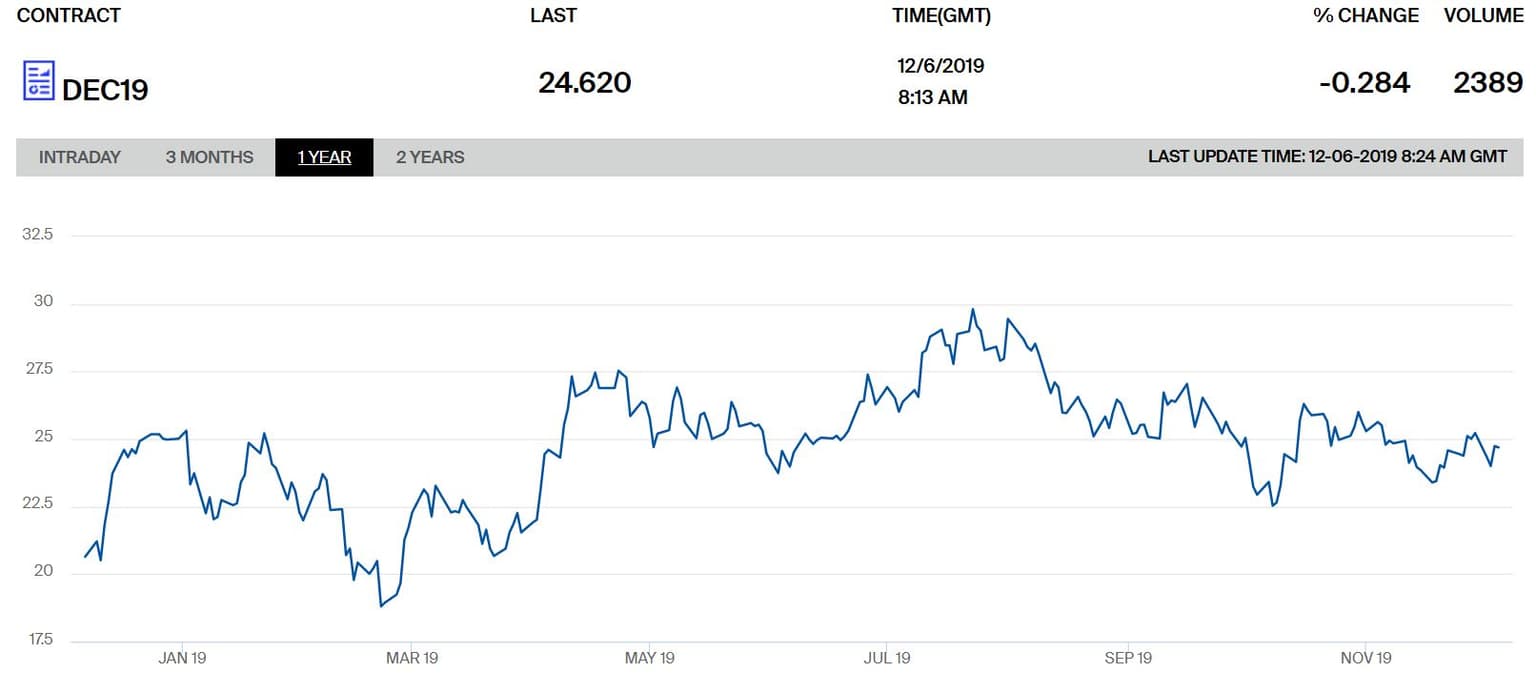 Vývoj ceny futures kontraktu na emisní povolenky s dodávkou v prosinci 2019 za poslední rok. Zdroj: ICE